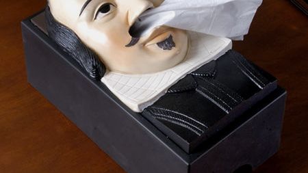 Od razu uprzedzam czepiaczy. Nie jest to klasyczne pudełko na chusteczki, ale pokrywa na pudełko na chusteczki. Tak czy inaczej, jeżeli ktoś ma ochotę popłakać i posmarkać podczas oglądania/czytania „Romea i Julii”, to Szekspir z nosem pełnym chusteczek będzie jak znalazł. Zakupić słynnego barda można tutaj.