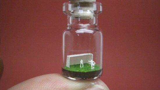 Tworzenie modeli w butelkach to bardzo chlubny dział modelarstwa, przeznaczony tyko dla tych najzdolniejszych. Oczywiście musiał znaleźć się ktoś, kto zacznie tworzyć nie w butelkach, ale w buteleczkach i butelczynach. Akinobu Izumi to człowiek, który za pomocą przede wszystkim papieru tworzy mikroskopijne dioramy w buteleczkach i fiolkach. Widoczni na zdjęciu futboliści mają 3 milimetry wysokości!