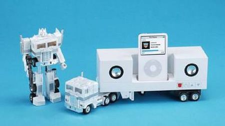 Czyli Optimus Prime w wersji białej. iPoda należy umieścić na przyczepie ciężarówki pomiędzy dwoma głośnikami. Do stacji dokującej pasują wszystkie duże odtwarzacze Apple'a. Co ciekawe, gadżet jest w pełni licencjonowany przez nadgryzione jabłko.