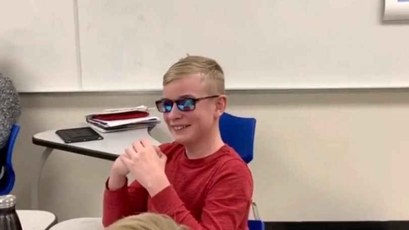 Nauczyciel, który prowadził właśnie lekcję o zaburzeniu rozpoznawania barw, sam jest daltonistą. Wiedząc, że jego 12-letni uczeń również cierpi na ten sam problem, postanowił mu pomóc. Pozwolił mu założyć swoje specjalne okulary, które pomagają w odpowiedni sposób postrzegać barwy.