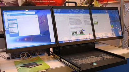 Jak sami widzicie na powyższym obrazku nowe urządzenie od firmy *ACME, *to najkrócej mówiąc trzy monitory w jednym. Można je złożyć i wtedy mamy do czynienia z małą, prostokątną walizką. Po rozłożeniu zaś nie potrzebują one oddzielnych kabli. Gadżet ten został wymyślony głównie dla osób pracujących w serwerowniach, bowiem po złożeniu idealnie mieści się on w szafach, w których stoją serwery. Do montażu na stałe (tj. z możliwością wysunięcie i rozłożenia do pracy) potrzebuje on trzech slotów.