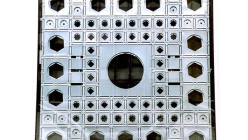 To, co widzicie na zdjęciu, to zaledwie fragment większej całości, znajdującej się na południowej ścianie Institut du Monde Arabe. Z pewnością za dużo to Wam nie mówi, więc wyjaśniam - to mechanicznie regulowane otwory, dzięki którym we wnętrzu można zmieniać natężenie światła i temperaturę.