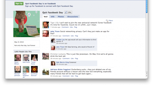 Grupa niezadowolonych użytkowników Facebooka organizuje masowy exodus z platformy - używając jej własnych metod i narzędzi do koordynacji swoich działań. Ich strona QuitFacebookDay.com, przekonuje odwiedzających, by zobowiązali się do opuszczenia portalu dokładnie 31 maja 2010 r. Poza wpisaniem się na listę “uczestników wydarzenia”, można ustawić również emailowe przypomnienie (będzie wysłane 31 maja rano). Oczywiście inicjatywę można także odnaleźć na Facebooku :)