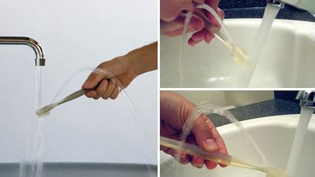 Czyli szczoteczka skrzyżowana z fontanną. Wystarczy ułożyć ją w odpowiedni sposób pod kranem i skierować strumień wprost do jamy ustnej.
