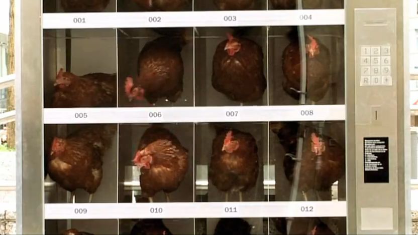 Losowi przechodnie, którzy mieli okazję zobaczyć maszynę na żywo, zamiast kupić jajka, dowiedzieli się dzięki napisom na "automacie", że 68% kur traktowanych jest przez hodowców jak maszynki do składania jaj. Poniżej był apel o kupowanie jaj z ferm organicznych (czyli po prostu ekologicznych).