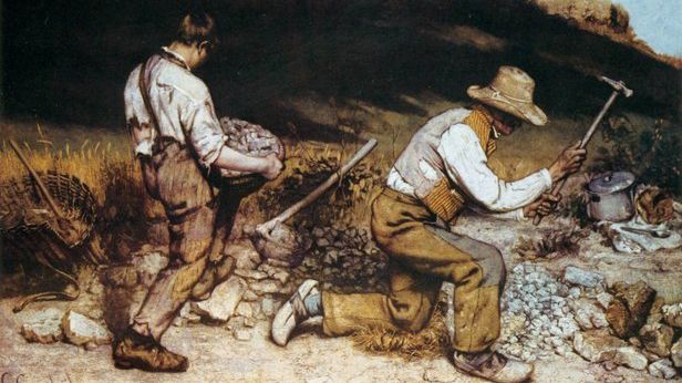 Jedno z moich ulubionych dzieł Gustave'a Courbeta i obraz mniej znany niż kolejne wymienione przeze mnie tytuły. "Les Casseurs de pierres" wywodził się z nurtu realizmu społecznego, który jednak miał niewiele wspólnego ze znanym nam rodzimym "socrealem". Przedstawiał dwóch chłopów kruszących kamienie. Było to jedno z najważniejszych dzieł tego malarza, urzekało oddaniem szczegółu przy naprawdę pokaźnych rozmiarach (165 x 257 cm).