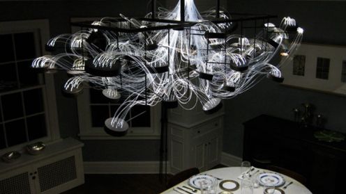 Czy to gigantyczny robot ośmiornica uchwycony podczas czajenia się pod sufitem? A może to jakieś wystające przewody, które pozostawiono z roztargnienia? Nie, to Bacterioptica - żyrandol, jakiego jeszcze w życiu nie widzieliście.