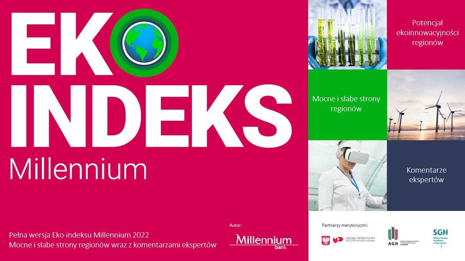 Raport "Eko-indeks Millennium: Potencjał ekoinnowacyjności regionów" to autorski projekt Banku Millennium, który został przygotowany we współpracy z partnerami merytorycznymi: Urzędem Patentowym RP, Akademią Górniczo-Hutniczą oraz Szkołą Główną Handlową. Opracowanie powstało, aby zbadać zaangażowanie poszczególnych regionów Polski w zieloną transformację.