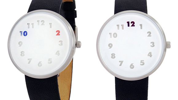 Można by pomyśleć, że zabrakło projektantom pomysłu na wykończenie tego zegarka. Tarcza obchodzi się bez wskazówek a ich rolę zastępują kolory.