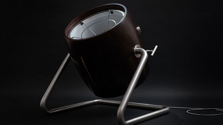 Zewnętrzny korpus wykonano z tropikalnego drewna wenge, dodatkowo lakierowanego. Jego ciemna barwa i wyrazisty podłużny deseń konfrontują się z doskonale gładką nogą ze stali szlachetnej, która zapewnia płynną regulację kąta nachylenia wiatraka w pionie.