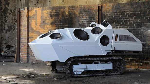 Wymyślony przez Nika Nowaka czołg muzyczny nie jest jedynie ciekawą koncepcją – ten etap jest już dawno za nim. Nik skonstruował jeżdżący egzemplarz, umieszczając na gąsienicowym podwoziu solidnie obudowane głośniki.