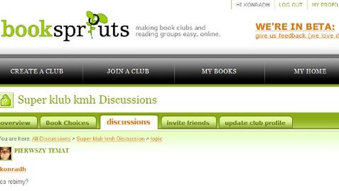 Kluby dyskusyjne to podobno świetna sprawa. Mi jeszcze nie udało się uczestniczyć w żadnym, ale czasem mam straszną ochotę na pogadanie na jakiś temat z grupą ludzi bez pośrednictwa internetu. BookSprouts to serwis oferujący właściwie kompletne narzędzie do organizacji tego typu spotkania.