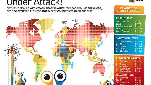AVG, tworząc mapę, korzystało z badań 100 mln komputerów PC w 144 krajach świata. Kryterium oceny była częstotliwość występowania infekcji w tych krajach. Wyniki zebrano w postaci raportu oraz kolorowej mapki. Wynika z nich, że najniebezpieczniejszymi krajami są Rosja i Turcja. W tym pierwszym kraju szansa na atak wynosi 1 do 10, w drugim: 1 do 15. Dość groźnie jest też Australii, USA (szansa zostania celem ataku: 1 na 44, dziewiąte miejsce) i Wielkiej Brytanii (1 na 63, trzydzieste miejsce).