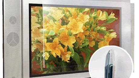 Widoczna na zdjęciu tarcza firmy LCDArm pasuje do ekranów o wielkości od 30 do 46 cali. Jest prawie całkowicie przezroczysta (98 procent przezroczystości) i ma wbudowany filtr UV. To tak na wypadek gdyby czyjś odbiornik nie przeszedł testów bezpieczeństwa i opalał jak solarium.