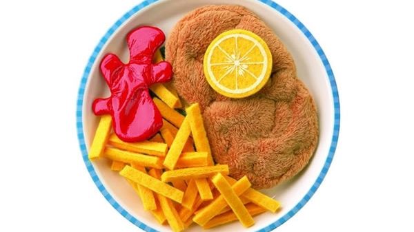 Swego czasu dobrym i modnym obyczajem było posiadanie w domu różnych sztucznych owoców. Dla ozdoby leżały w jakimś kryształowym pojemniku kurząc się i stanowiąc atrakcje dla dzieci. To co widzicie na obrazkach to również sztuczne jedzenie, lecz w przeciwieństwie do tego znanego z PRLu zamiast plastikowego jest pluszowe!