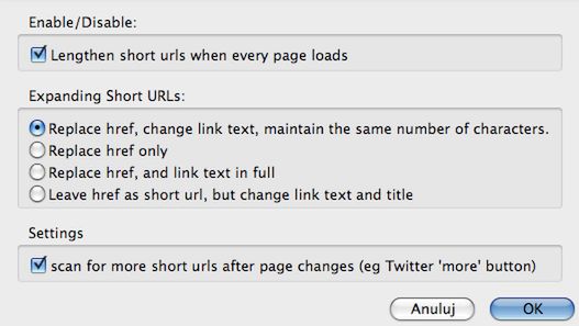 Jeżeli korzystasz z Firefoksa, to na pewno zainteresuje Cie pewien dodatek o nazwie Long URL Please - jak nietrudno się domyślić sprawia on, że krótkie adresy ponownie stają się dłuższe, dając jednocześnie większą szanse na odszyfrowanie docelowej strony. Dodatek ten obsługuje 64 najpopularniejsze serwisy skracające adresy.
