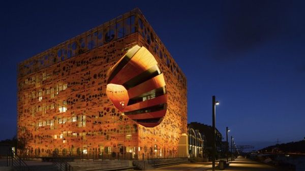 Budynek idealnie wpasowuje się w nadrzeczny, industrialny krajobraz Lyonu i pomimo intensywnego koloru nie szpeci wcale panoramy miasta. Charakterystyczna barwa nie została zresztą wybrana bez powodu. Oranż ma budzić skojarzenia z minią ołowiową, która była często stosowana w przemyśle, aby zapobiec rdzewieniu metalowych konstrukcji. Z kolei siatka otworów imituje wodę skroploną na ścianach nadrzecznych budynków.