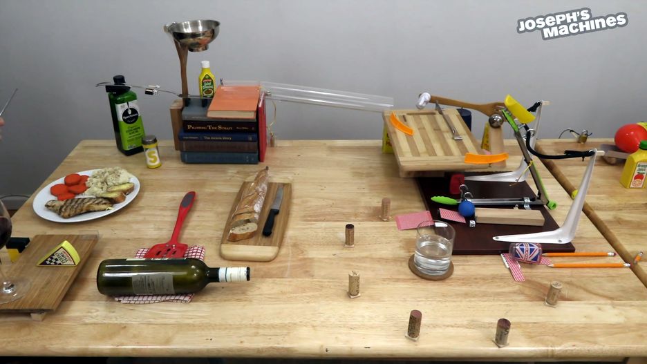 Broughton wcale nie wyciąga ręki z pieprzniczką do Herschera. Z jednego końca stołu wprawia w ruch całą skomplikowaną maszynerię złożoną z widelców, słomek, noży, kubków, owoców i warzyw, a nawet laptopa, sztang i wielu innych przedmiotów. W większości ruch pomiędzy kolejnymi elementami jest przenoszony przez toczące się czy wystrzeliwane kuliste lub walcowate przedmioty.