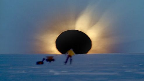 Tak naprawdę to, co macie okazję oglądać powyżej, powstało z nałożenia na siebie czterech fotografii. Celem retuszu i przeróbek było uzyskanie bardziej „dramatycznego” efektu. Biel i pustka pustyni śnieżnej, przesłaniająca naszą gwiazdę dzienną tarcza Księżyca i niesamowita poświata wychodząca gdzieś spoza ziejącej czernią dziury – tak, ten obraz przemawia do wyobraźni.