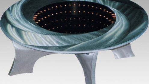 Imitacja luki w powierzchni wszechświata została wykonana popularnym i dość tanim sposobem, który wykorzystuje lustra i diody LED. Do tego dodano szklany blat, aluminiowe nogi, nazwisko projektanta i metkę z bonusowym zerem.
