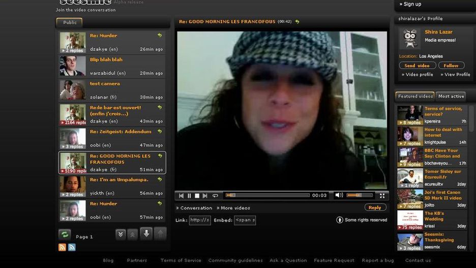 Oczywiście są czatroomy, gdzie możemy pogadać sobie przez kamerę na żywo, jednak tutaj będziemy zamieszać bardziej posty video, stąd możliwość udziału wielu osób w konwersacji. Seemic określiłbym jako video – czatroom. Zasada działania jest bardzo prosta. Ktoś zamieszcza video z wypowiedzią na jakiś temat. My natomiast możemy na ten klip odpowiedzieć wrzucając swoje nagranie. Przy wysyłaniu tagujemy je pod względem języka, stąd możemy zobaczyć, że na razie najpopularniejsze konwersacje odbywają się po angielsku i francusku.