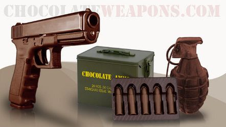 Czekolada to naprawdę bardzo ciekawy wyrób spożywczy. Jej właściwości są powszechnie znane. Oprócz tego, że jest bardzo kaloryczna, potrafi również dzięki substancjom psychoaktywnym poprawić ludziom nastrój. Czy czekoladowy pistolet lub granat poprawiłby wasze samopoczucie?