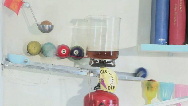 Sznurek przypięty do obrazu przechyla go, uwalniając kolejne kule, które toczą się po wyznaczonych ścieżkach. Jedna z nich przeważa naczynie, które przelewa swoją zawartość do drugiego - następuje reakcja chemiczna, lont zostaje odpalony, a kule bilardowe toczą się dalej. Co znajduje się na końcu tej imponującej reakcji łańcuchowej?