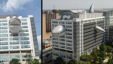Czym jest Discovery Channel, tego nikomu wyjaśniać nie muszę. Ale za to bardzo chętnie zaprezentuję, w jaki sposób stacja ta postanowiła uczcić Shark Week 2010. Otóż przyozdobiono siedzibę stacji gigantycznym rekinem, który wygląda tak, jakby wyskoczył on z oceanu i wbił się w budynek (kojarzy się nieco z WTC, prawda?). Rekin zwie się "Chompie" i składa się z pięciu części - zobaczycie je Państwo na zdjęciach. Na właściwych pozycjach trzymają je liny i kable. Efekt? Imponujący. Jeśli ktoś chciałby zobaczyć to na żywo, musi wybrać się do Silver Spring w stanie Maryland.