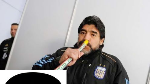Mężczyzna z trąbką to Diego Maradona, „trener” reprezentacji Argentyny, a fotoszopka odnosi się do jego burzliwego życia. Nic więcej nie trzeba mówić, naturę białego proszku widocznego na zdjęciu można z łatwością poznać po lekturze któregoś z licznych artykułów o piłkarzu.