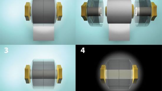 Otóż obrotowy rdzeń służy do generowania energii elektrycznej. (A przynajmniej może służyć temu zadaniu, ponieważ gadżet, o czym piszę, jest na razie tylko konceptem.) Podczas każdej wizyty w toalecie i wprawienia w ruch rdzenia można by z wyłapanej energii kinetycznej wytwarzać prąd, który byłby magazynowany w bateriach umieszczonych po bokach pomysłowego pojemnika na papier - widzicie go na fotografii powyżej. Klapkę pojemnika można by zaś wyposażyć w energooszczędne świetlówki i tym samym powstałaby lampka oświetlająca miejsce, gdzie wielu odbywa dość specyficzne posiedzenia.