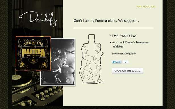 Gdy po aktywnie spędzonym dniu relaksujesz się, patrząc w bladą poświatę monitora warto mieć pewność, że relaks przebiega w optymalnych warunkach – pomoże w tym serwis Drinkify.org. Działanie sieciowej usługi jest banalnie proste – na stronie wystarczy podać nazwę zespołu, by pojawiła się sugestia alkoholu, idealnie komponującego się z muzyką.