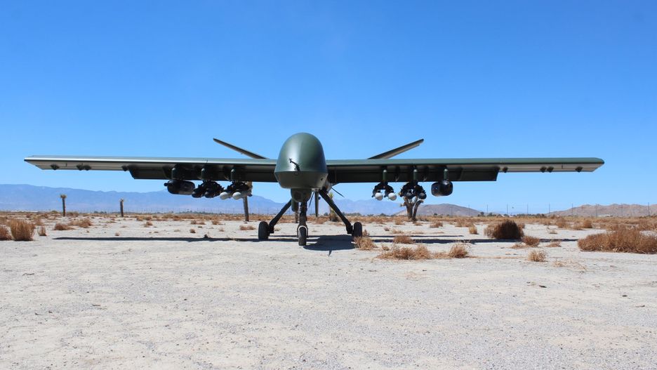 General Atomics Aeronautical Systems opublikował nowe zdjęcie swojego eksperymentalnego drona Mojave uzbrojonego w różne rodzaje broni, w tym parę zasobników Dillon Aero.