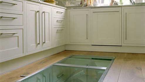 Jak wyobrażacie sobie piwnicę na wino? Przypuszczam, że nie w ten sposób. Do tej konkretnej piwnicy prowadzą przeszklone drzwi umieszczone w podłodze na środku kuchni.