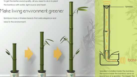 Projektant Jocko Chan wymyślił sposób, jak pogodzić i harmonijnie połączyć umiłowanie człowieka do słuchania wcale nie cichej muzyki z naturą - w której z kolei najpiękniej (po szumie drzew i śpiewie ptaków) brzmi cisza. To zestaw głośników, w których pudła rezonansowe ... rosną - bo tworzą je żywe, bambusowe łodygi.