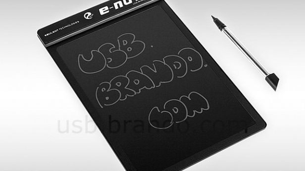Urządzenie firmy USB.Brando jest chyba najprostszym notatnikiem elektronicznym - do dyspozycji mamy 8,5-calowy ekran na którym możemy utrwalić jedną stronę zapisków. E-note ma służyć raczej jako tablica do szybkich notatek, która mogłaby zastąpić np. karteczki przypinane na lodówce, dlatego zapisanej strony nie da się eksportować. Praktycznie jedyną funkcją urządzenia jest pisanie za pomocą rysika oraz wymazywanie.