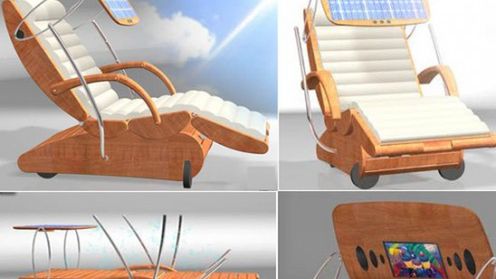 Dziś coś w sam raz na duszne, burzowe i upalne niedzielne lenistwo: fotel niezwykły, bo wielopozycyjny i będący jednocześnie mobilnym kinem domowym. To ostatnie zaś zasilane energią słońca. Sam fotel zbudowany z drewna teakowego oraz aluminium.