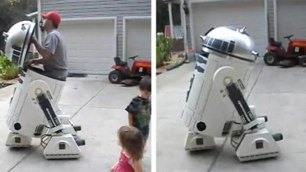 Kopia filmowego R2D2 mogąca pomieścić dorosłego mężczyznę została wyposażona w głośniki, migające diody LED oraz - oczywiście - silnik. Realizacja projektu nie była chyba zbyt kosztowna - autor chwali się, że za korpus robota posłużyła zwykła plastikowa beczka. Całość robi piorunujące wrażenie, zwłaszcza na dzieciach pomysłowego geeka. Popatrzmy na wideo: