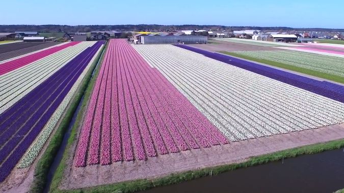 Dutch flower fields near Keukenhof, The Netherlands drone footage