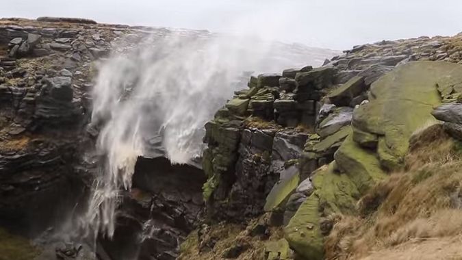 Wiatr jest tak silny, że spadająca woda po prostu… “zawraca”. Takie nietypowe zjawisko można zaobserwować między innymi przy wodospadzie Kinder Downfall.