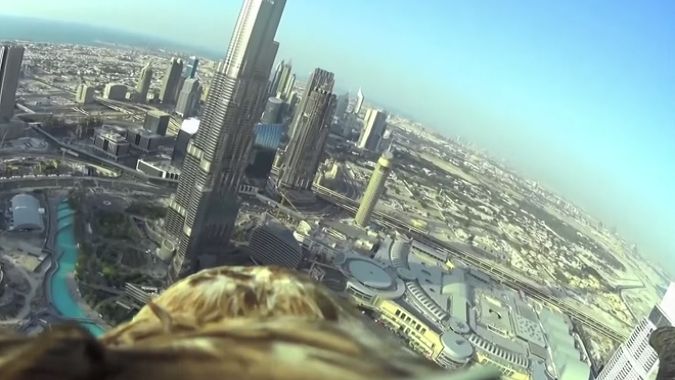 Eagle with Sony Action Cam flies off top of Burj Khalifa in Dubai