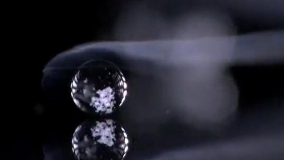 Nagranie ma tempo 3 tysięcy klatek na sekundę i ukazuje tworzącą się wokół kropelki "osłonę" z pary wodnej, która przez kilka chwil sprawia, że woda nie wyparowuje.