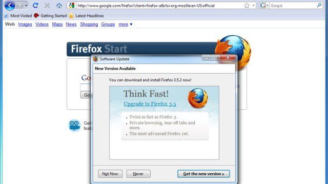 Dotychczas każdy kto chciał zainstalować najnowszego Firefoxa, musiał poszukać odpowiedniej opcji korzystając z menu. Teraz aplikacja sama przypomni nam o tym, żeby to zrobić. W wyświetlanym oknie pojawią się informacje o zaletach nowej wersji i jej przewadze nad poprzednimi odsłonami. Użytkownicy przeczytają m.in. o tym, że Firefox 3.5.2 jest dwa razy szybszy od przeglądarki opatrzonej numerem 3.0.13.
