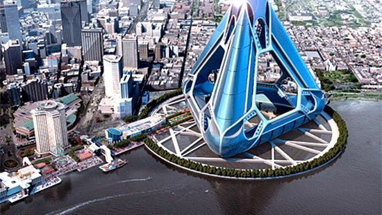 Olbrzym z trójkątem w podstawie, miałby być huraganoodporny. W środku znajdzie się miejsce na 20 000 mieszkań, 3 hotele 920 000 metrów kwadratowych powierzchni do komercyjnego użytku, centra kulturowe, biura, klinika z 20 000 miejsc oraz 3 kasyna.
