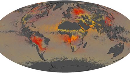 Ta mapa pokazuje nam globalne rozmieszczenie i natężenie aerozoli na świecie w sierpniu 2010 roku. Żółte strefy oznaczają duże skupiska cząsteczek, takich jak pył i sól morska. Kolor czerwony symbolizuje smog i inne szkodliwe zanieczyszczenia. Im jaśniejszy i bardziej intensywny kolor, tym więcej zanieczyszczeń. Na szaro zaznaczono strefy, o których brakowało wystarczających danych.