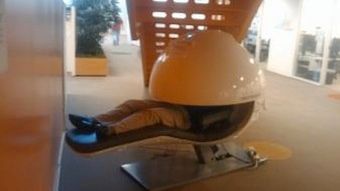„Fotel”, z którego wystają ludzkie nogi to MetroNap EnergyPod. Nietypowe skrzyżowanie krzesła z łóżkiem umożliwia podobno przyjęcie optymalnej dla drzemiącej osoby pozycji, zapewniając najlepszy przepływ krwi i minimalny nacisk na dolną część pleców.