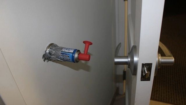 Wszystko, czego potrzebujecie, to taśma klejąca i trąbka na sprężone powietrze, którą kupicie choćby na Allegro. Powyższe zdjęcie powinno być wystarczającą instrukcją dla każdego, kto ma ochotę zrealizować hałaśliwy dowcip. Wystarczy przykleić syrenę na sprężone powietrze do ściany z włącznikiem skierowanym w kierunku klamki.