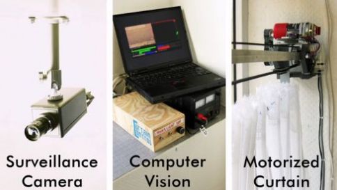 Do konstrukcji tej pomysłowej robofiranki wykorzystano kamerę bezpieczeństwa, laptopa i silnik połączony z karniszem i zasłonką. Kiedy kamera wykrywa czyjąś obecność za oknem warsztatu, komputer steruje zasłonką, tak aby podążała za potencjalnym podglądaczem.