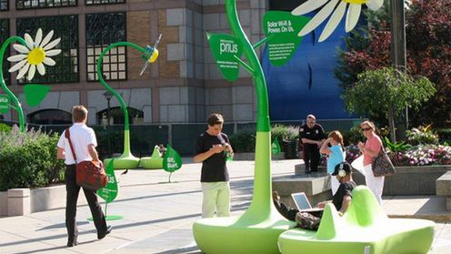 Kwiatek to przede wszystkim HotSpot. Za darmochę można połączyć się z Internetem i np. czytać gadżetomanię (chociaż pewnie Amerykanie akurat tego nie robią). Jednak to nie wszystko, bo pod roślinkę można się podłączyć w celu podładowania akumulatorków. Energia jest wytwarzana przez panele słoneczne umieszczone na płatkach kwiatka.