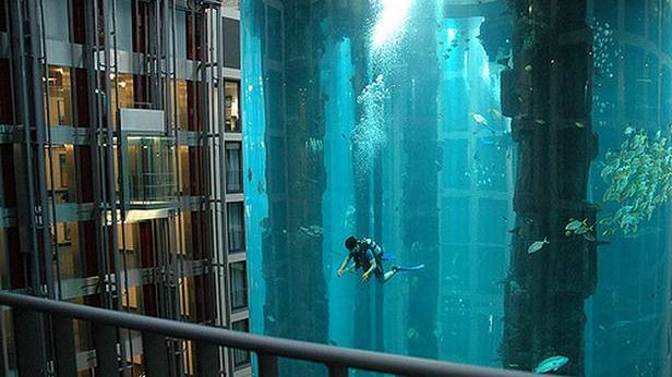 Berliński hotel postanowił uraczyć swoich gości niespotykanym widokiem – w hotelowym lobby znajduje się akwarium mieszczące 1,5 tys. tropikalnych ryb. Nietypowa dekoracja okazała się tak duża, że nie było mowy o wniesieniu jej do hotelu. To budynek trzeba było zbudować wokół postawionego wcześniej akwarium.