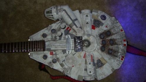 Gitara powstała na bazie starej zabawki wzorowanej na słynnym statku kosmicznym. Lichy plastik z którego skonstruowano model nie był w stanie wytrzymać ogromnego napięcia strun, jednak problem ten rozwiązano wykorzystując niewielki kawałek drewna. Dodatkowo w korpusie wiosła zainstalowano nawet diody LED, które niestety wymagają dodatkowego zasilania. Travis zapewnia, że gitara nie ma żadnych problemów z brzmieniem, ale wydaje mi się, że wcale nie chodziło mu o to, by skonstruować koncertowy instrument.